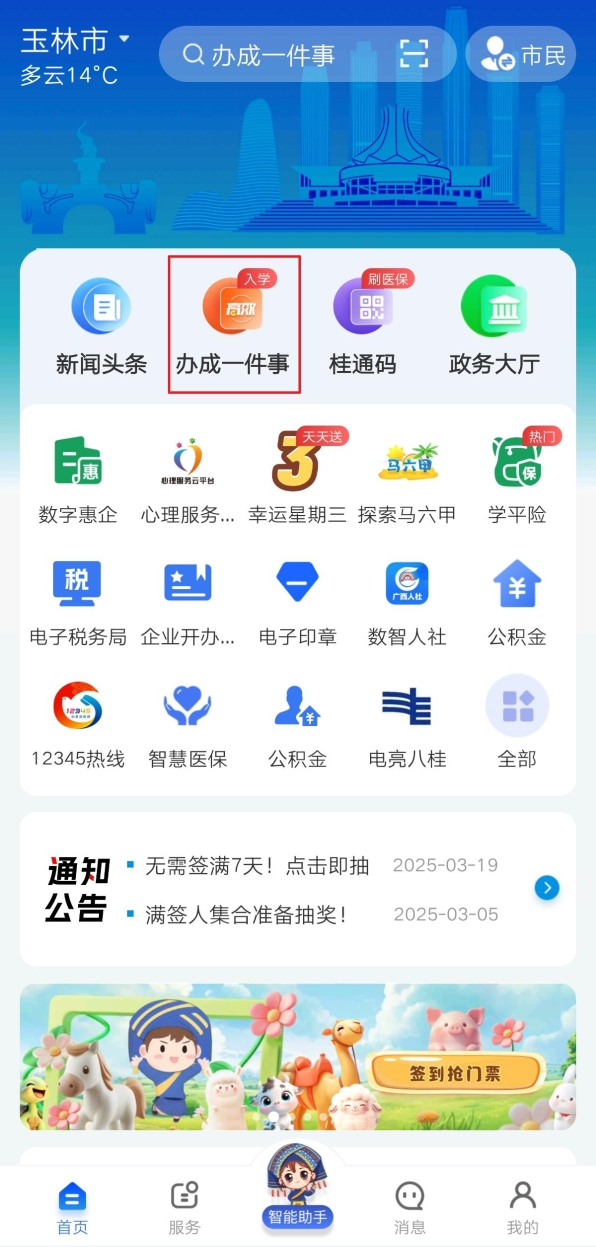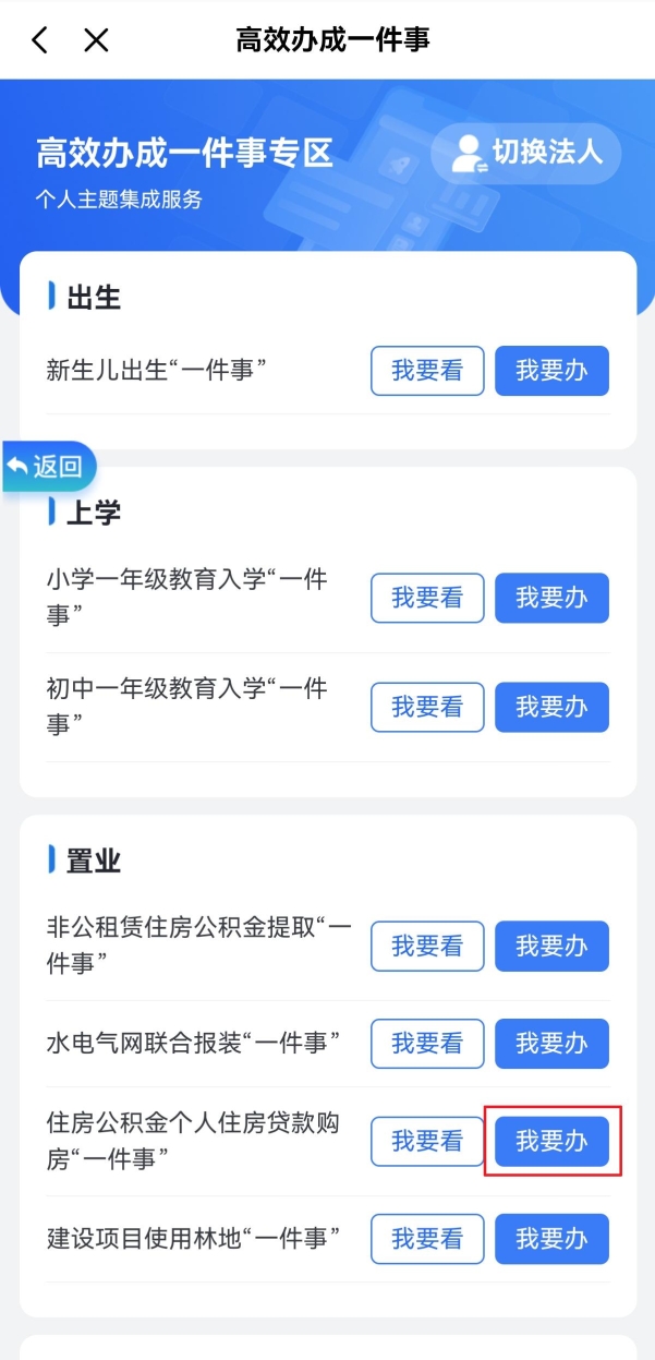首次注册登录后,在首页点击【办成一件事】,在跳转的页面中找到【住房公积金个人住房贷款购房“一件事”】点击【我要办】。