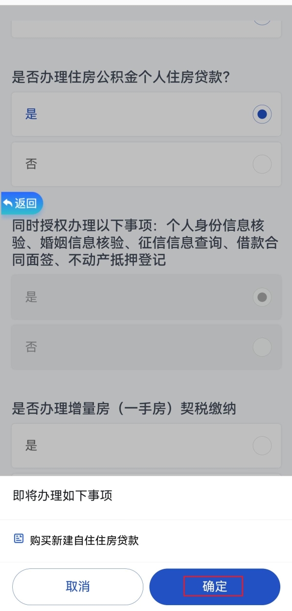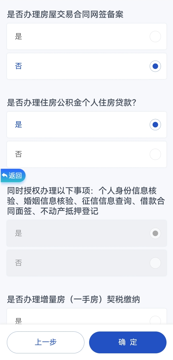 是否办理房屋交易合同网签备案:否;是否办理住房公积金个人住房贷款:是;是否办理增量房(一手房)契税缴纳:否;点击【确定】,进入信息填写环节。
