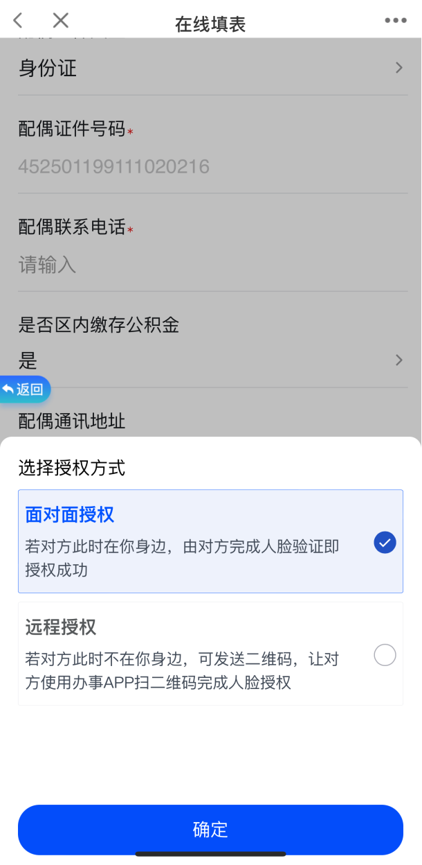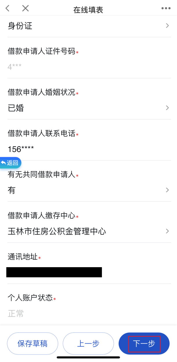 如申请人婚姻状态为未婚则选择未婚,如为已婚则选择已婚状态系统自动获取配偶个人信息(如无法获取则手填),配偶如缴存住房公积金,则须配偶刷脸授权获取住房公积金缴存信息。信息填写完毕点击【下一步】。