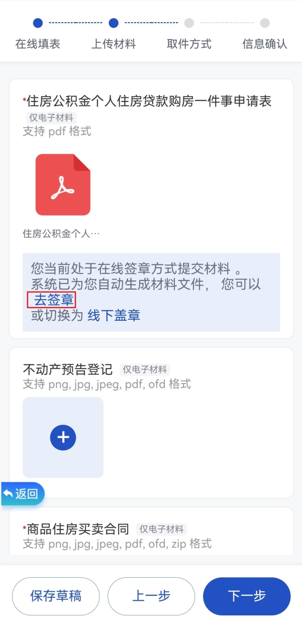 点击住房公积金个人住房贷款购房一件事申请表【去签章】(首次签章须先申领个人电子印章,如果有共同借款人则需要共同借款人共同用印),按照电子档按要求拍摄上传有效身份证件正反面、商品房买卖合同登记备案证明、首付款发票或收据或资金托管凭证、商品住房买卖合同等扫描件,点击【下一步】。