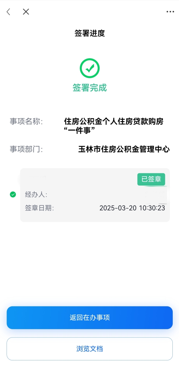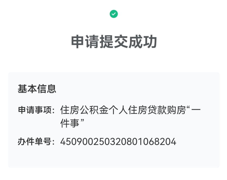 信息确认无误点击【提交】即办理完成,贷款申请将会在3个工作日内审批完成,通过审批的,需到房屋所在地的公积金中心柜台进行借款合同等材料面签,面签时请携带身份证件、结婚证、购房合同、首付款发票等材料原件。