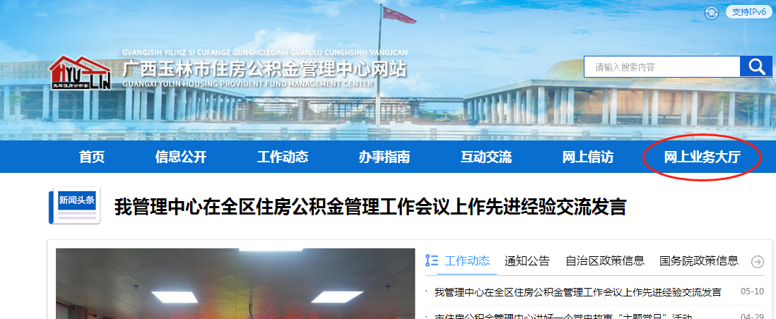 1、单位填写《住房公积金汇(补)缴书》和《住房公积金调整清册》,电脑百度搜索“广西玉林市住房公积金管理中心网站”首页,选择“网上业务大厅”。