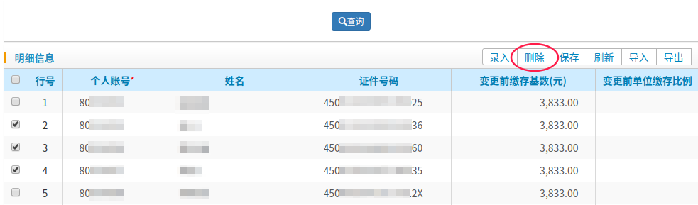 单位人数较少的(如20人以下的):在个人基数调整界面中点击“查询”,系统显示所有在职职工信息后,在需要调整基数职工的“变更后缴存基数”项中填写上新的缴存基数,与单位的材料核对“月缴存额”是否一致;不需要调整基数的职工则勾选“行号”项前的方框,选择删除,录入所需调整基数职工的信息后,上传材料提交即可。
