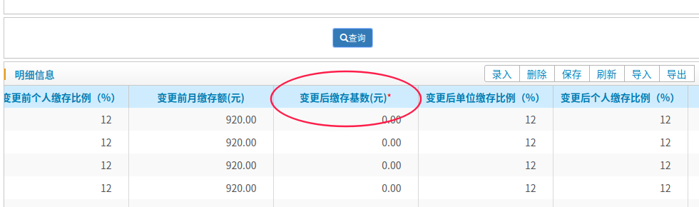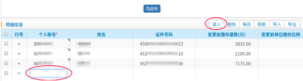 图片演示:无需点击“查询”,直接点击“录入”录入需调整基数职工的个人账号。