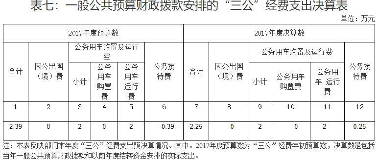 2017年度一般公共预算财政拨款安排的“三公”经费支出决算中,因公出国(境)费支出决算0万元;公务用车购置及运行费支出决算2万元;公务接待费支出决算0.25万元。