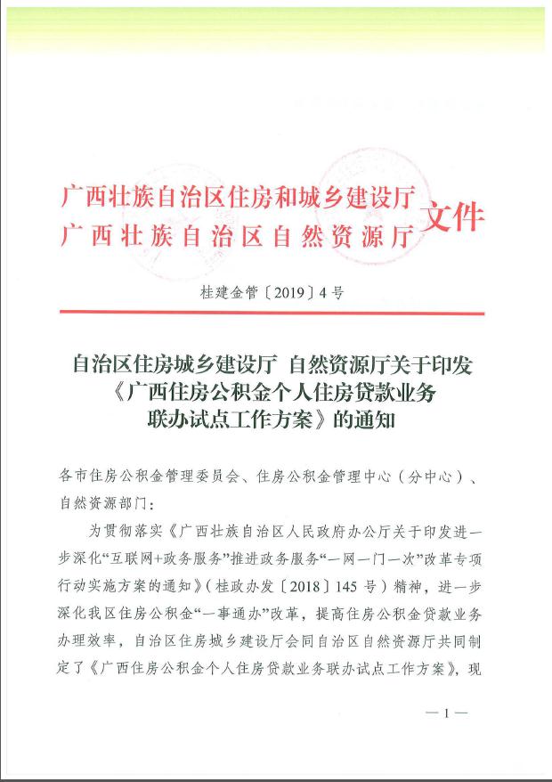 桂建金管[2019]4号自治区住房城乡建设厅自然资源厅关于印发《广西住房公积金个人住房贷款业务联办试点工作方案》的通知